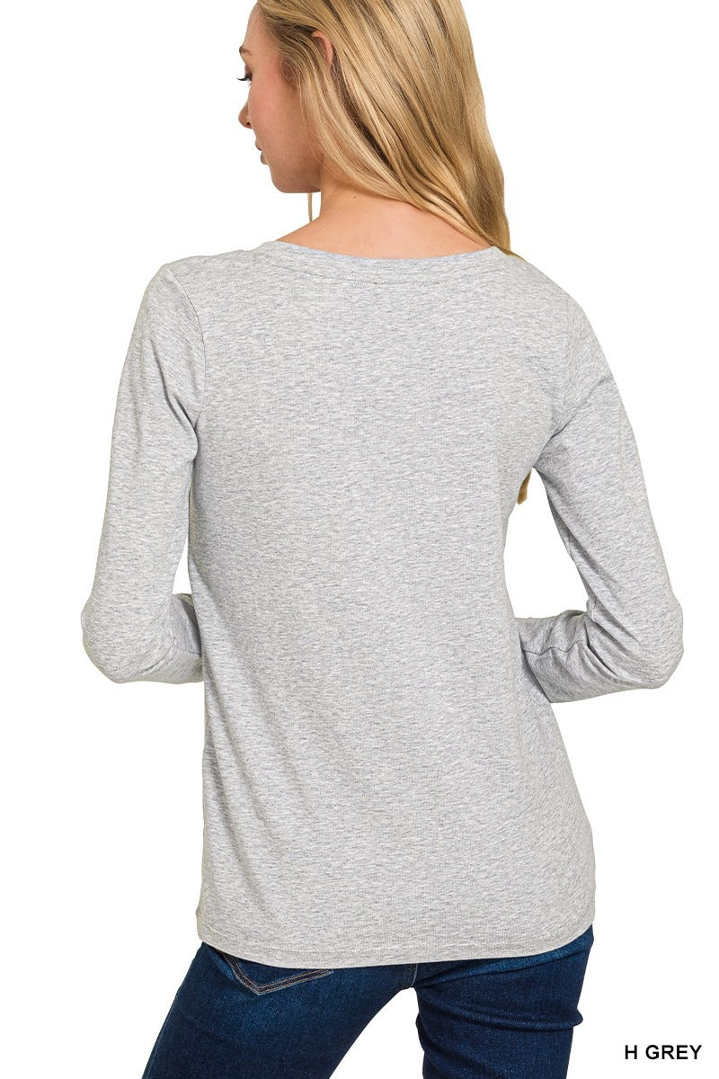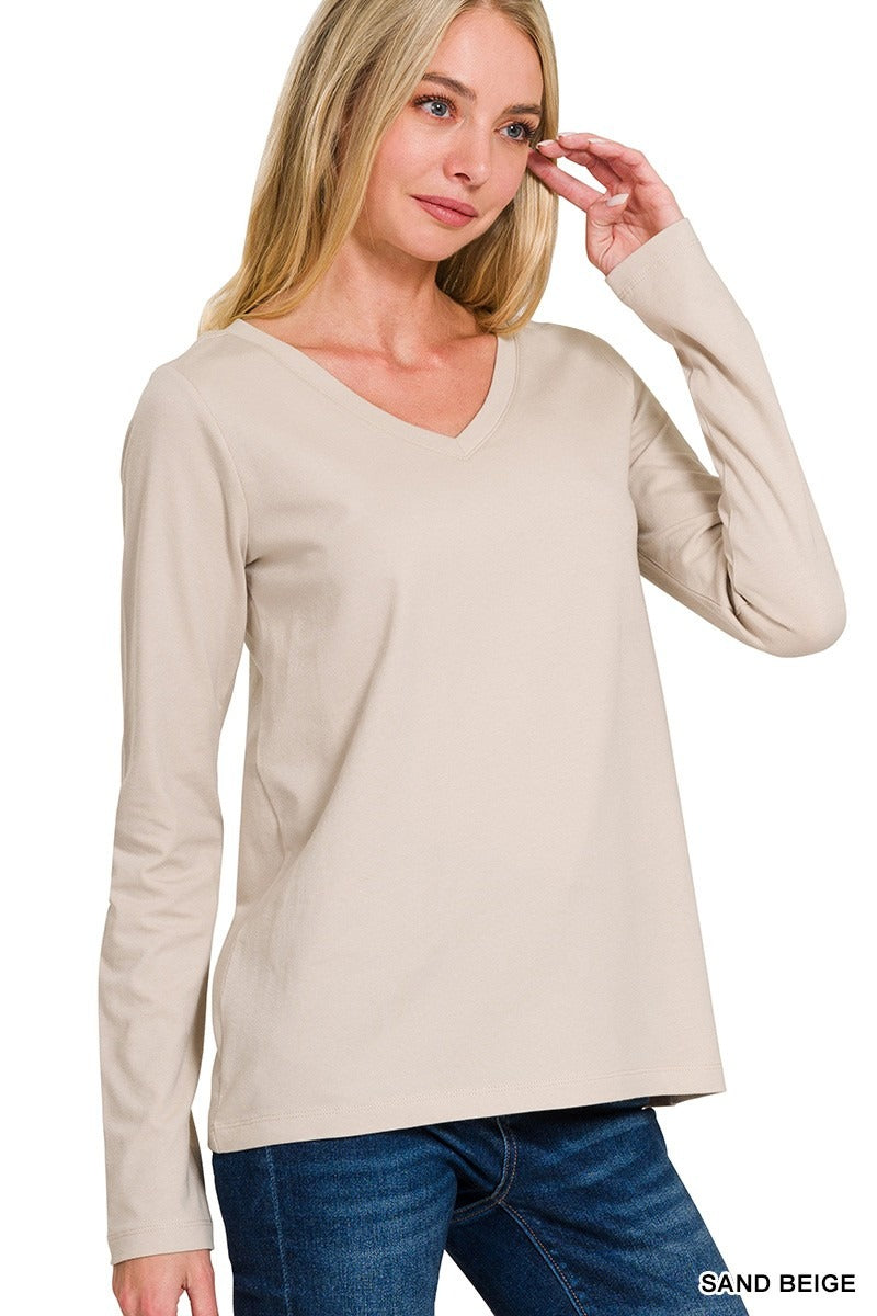 Cotton V-neck long sleeve T-shirt in a relaxed everyday fit. Soft cotton blend knit with a touch of stretch, perfect for layering under jackets or wearing on its own.