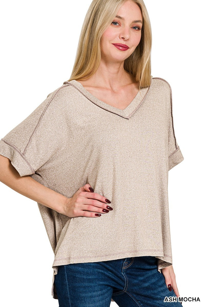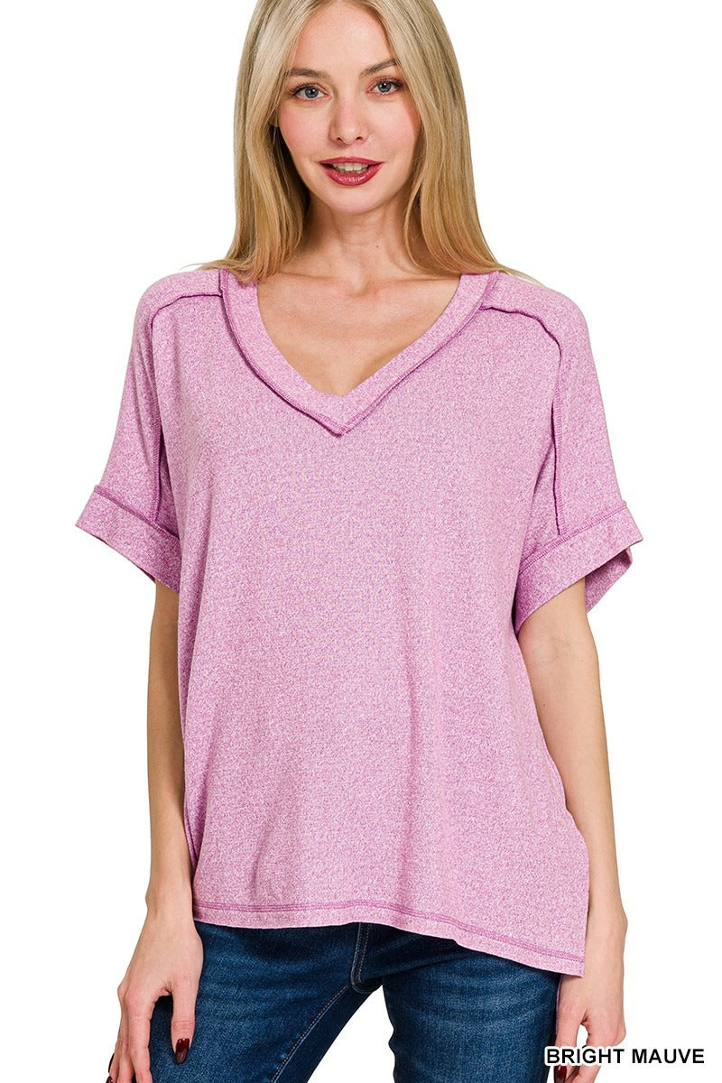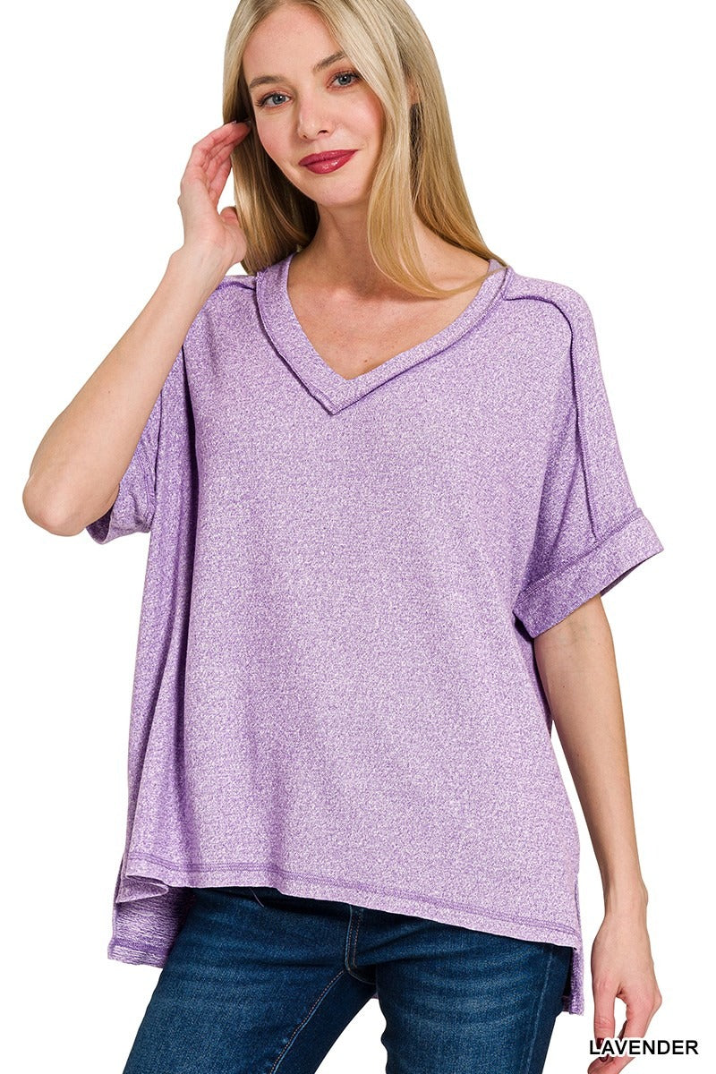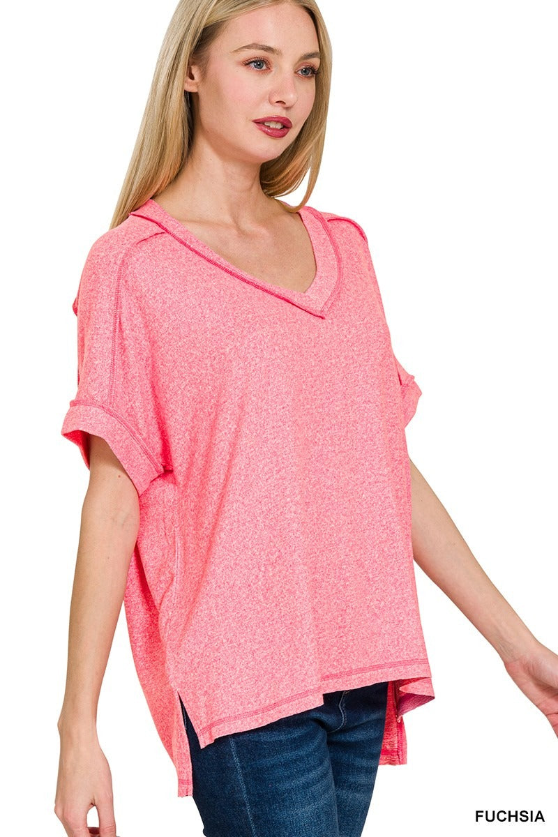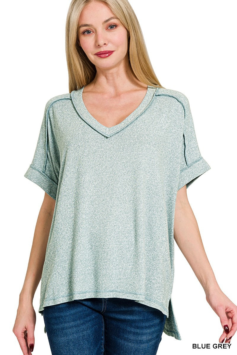 Soft melange hacci V-neck hi-low tee with folded short sleeves and side slits. Relaxed oversized fit with exposed seams for an easy draped look over denim or leggings.