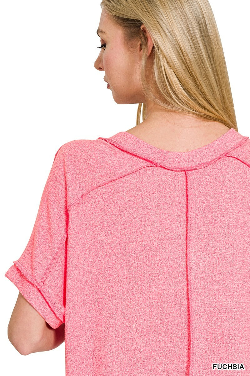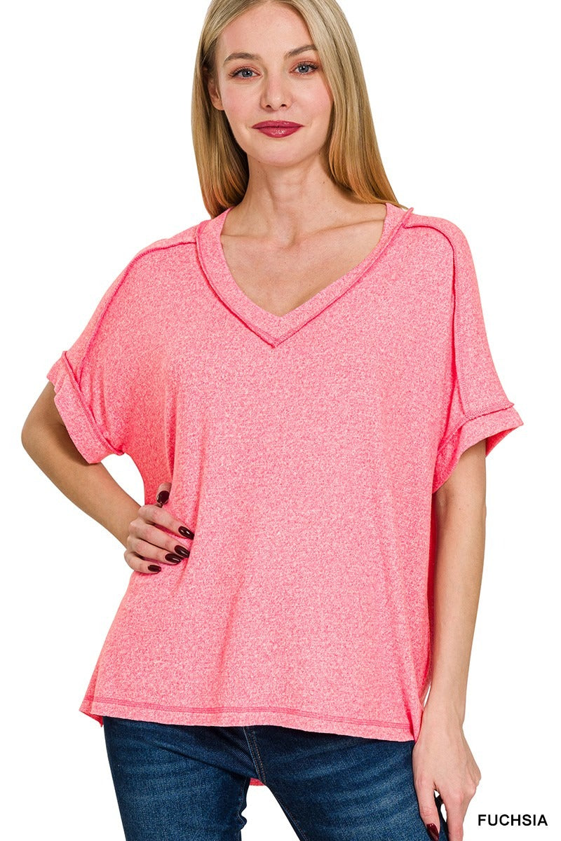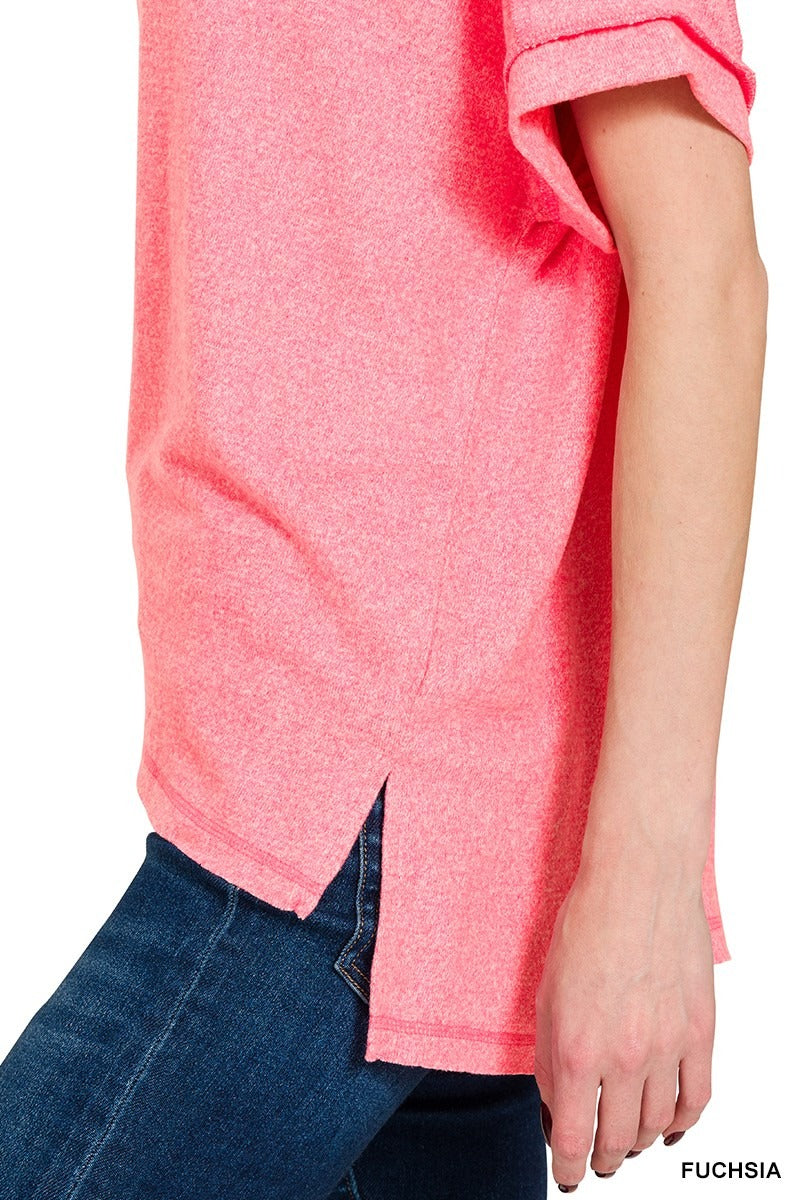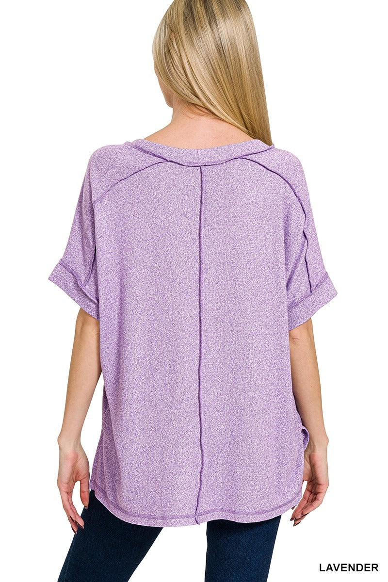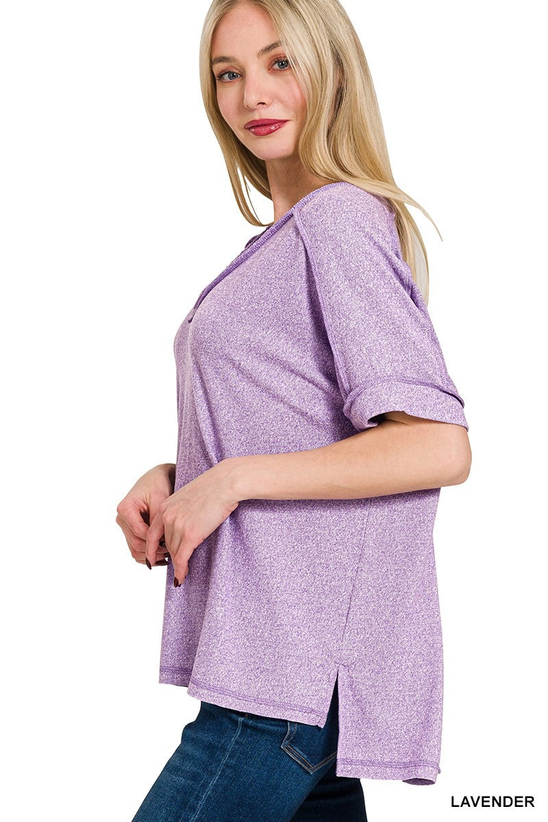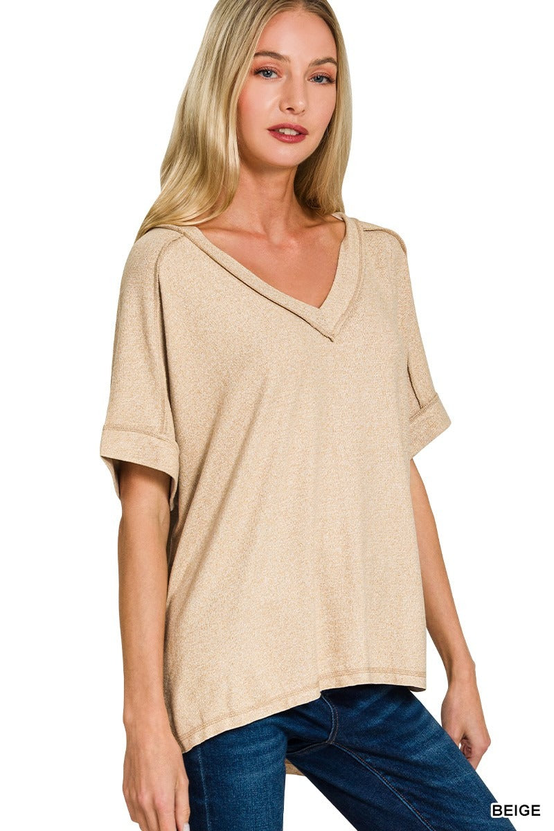 Soft melange hacci V-neck hi-low tee with folded short sleeves and side slits. Relaxed oversized fit with exposed seams for an easy draped look over denim or leggings.
