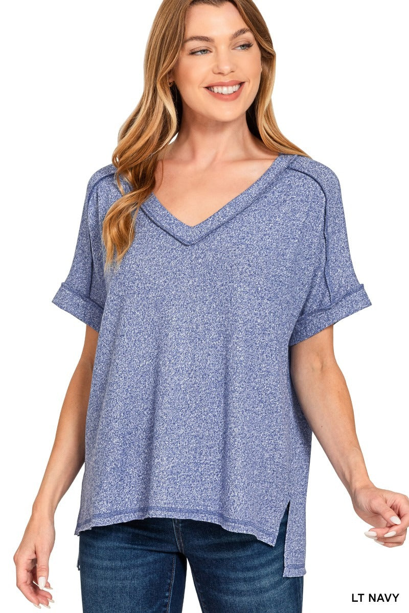 Soft Melange Hacci V-neck Hi-Low Short Sleeve Tee